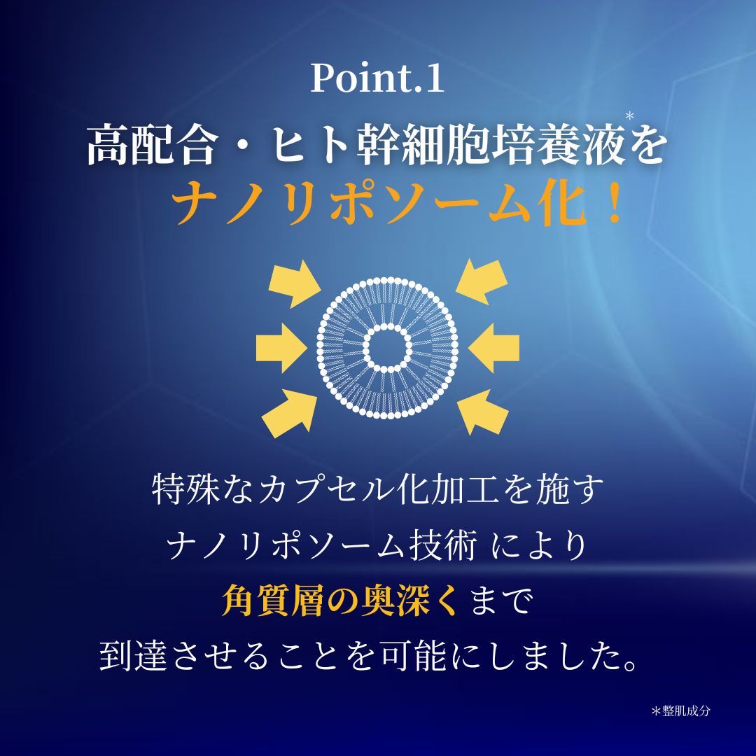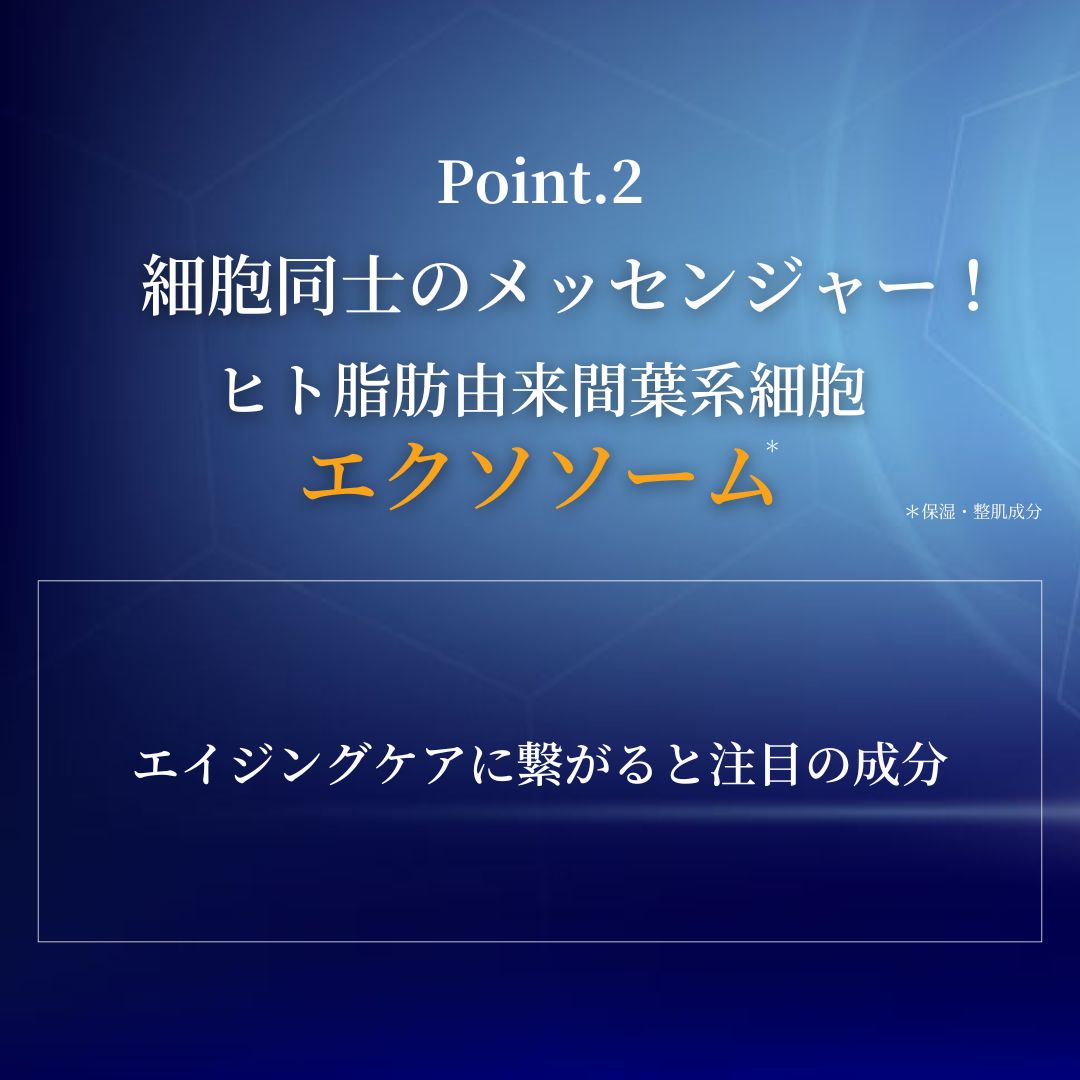 細胞間の伝達物質として知られているエクソソームをベースに、ナノリポソーム化したヒト幹細胞培養液を高濃度で配合し、希少成分の浸透率の高さにこだわったスペシャルセラム。続けてお使いになることで、肌の土台を育みながらエイジングケア*をサポートします。
