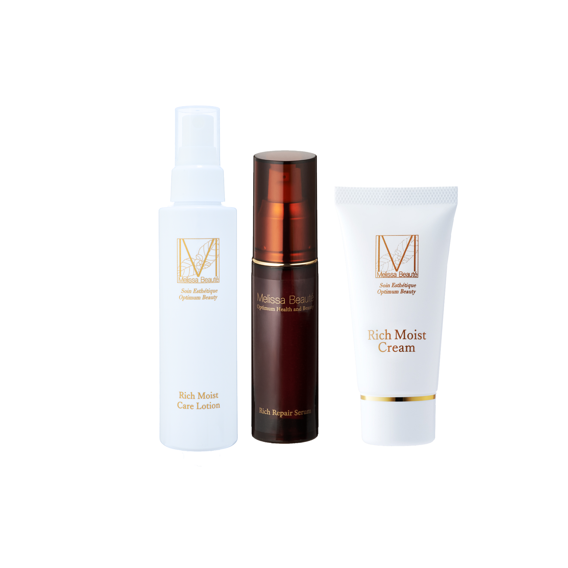 1月末までのお得な期間限定セット!抗シワ効能評価試験合格のセラム&クリームに加え、潤いの持続性が高いと大好評の高浸透・化粧水のリッチモイストセットは、ハリ・艶を出し若々しい健康肌へと導きます。